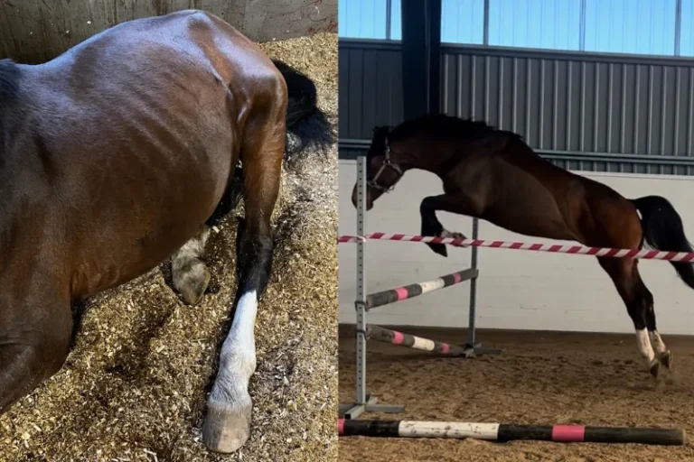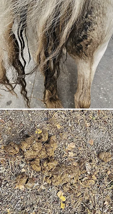 ”Ridskolans hästar fick snabb hjälp av Nutribiome när magproblem uppstod vid installningen och byte av hösilage. Det är bara 24 timmar mellan bilderna på ridskolehästen Hector.