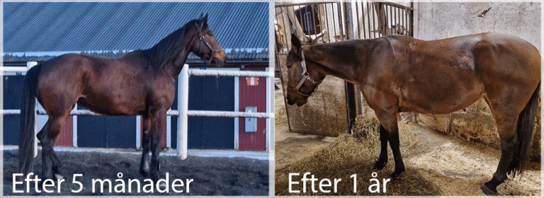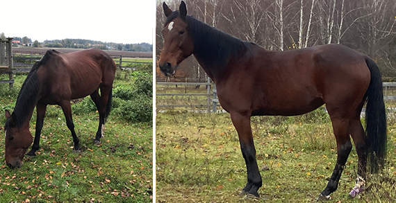 Båda var vid omhändertagandet kraftigt undernärda och var från början svåra att få upp i vikt. Efter att Equibiomes fodertillskott tillsattes gick viktuppgången fort. Det är endast 3 veckor mellan bilderna.