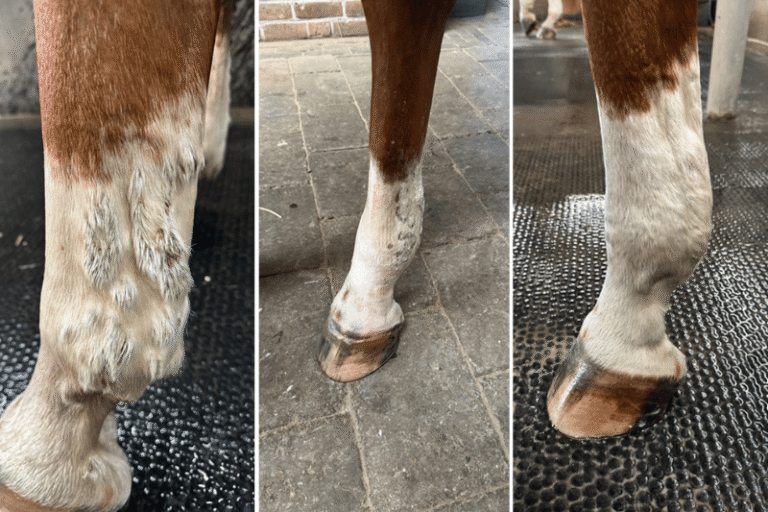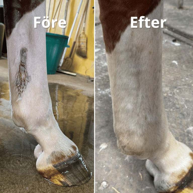 ”En produkt vi använder dagligen i stallet. Allt från mugg/rasp till känslig hud. Före och efter bilder på en av våra hästar med känsliga vita ben. Även fast hon är bra nu fortsätter vi med SkinCare. Alla våra hästar äter även Proferm dagligen för bästa boostern inifrån 🦄”